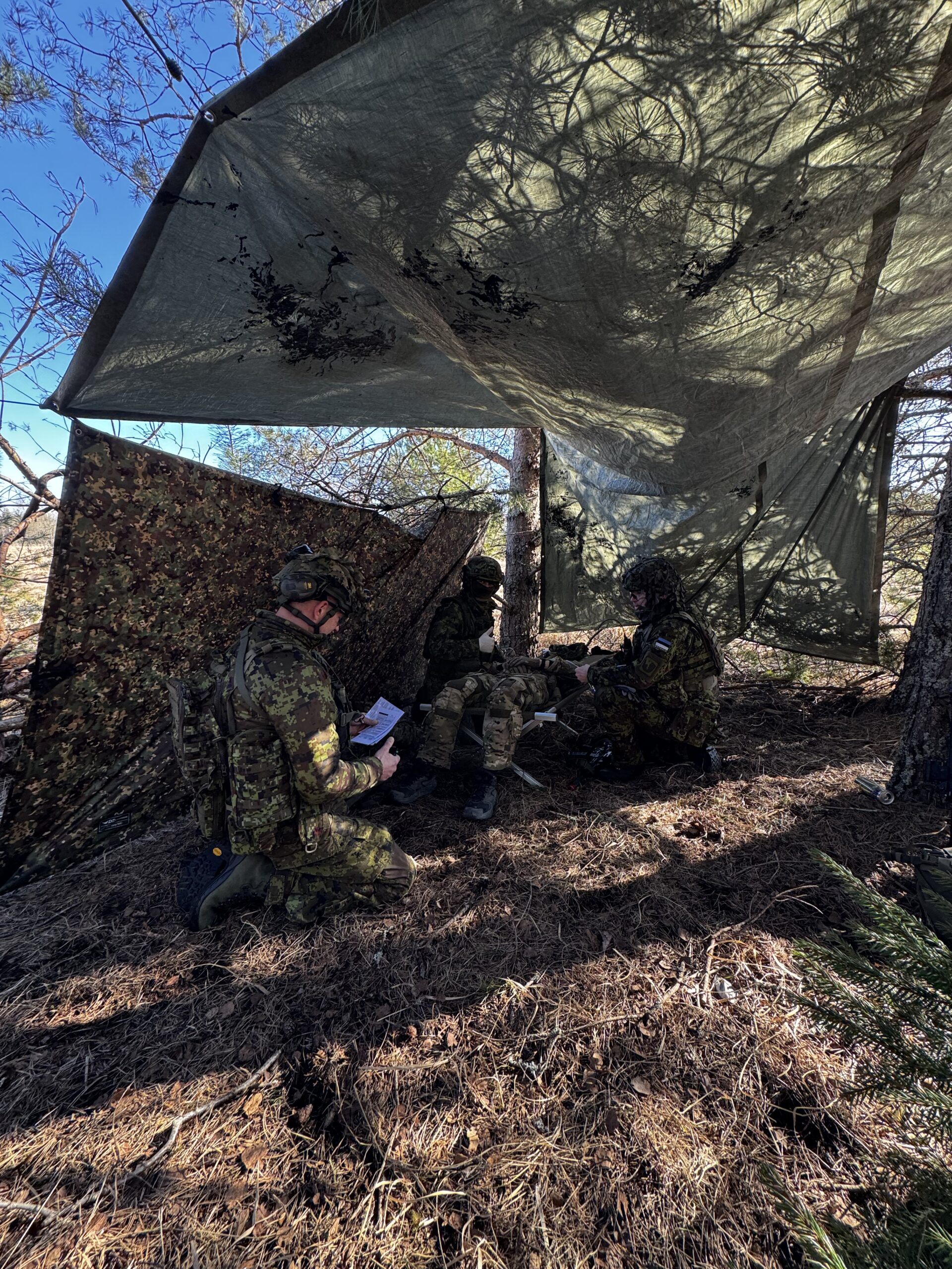 Hommikul harjutasime veel kord käsu andmist ning liikusime oma tegevusaladele. Püstitasime haavatute kogumispunkti ja saavutasime kiiresti valmisoleku haavatute vastuvõtuks. Suur tänu Viru ja Rapla malevate instruktoritele toetuse eest!